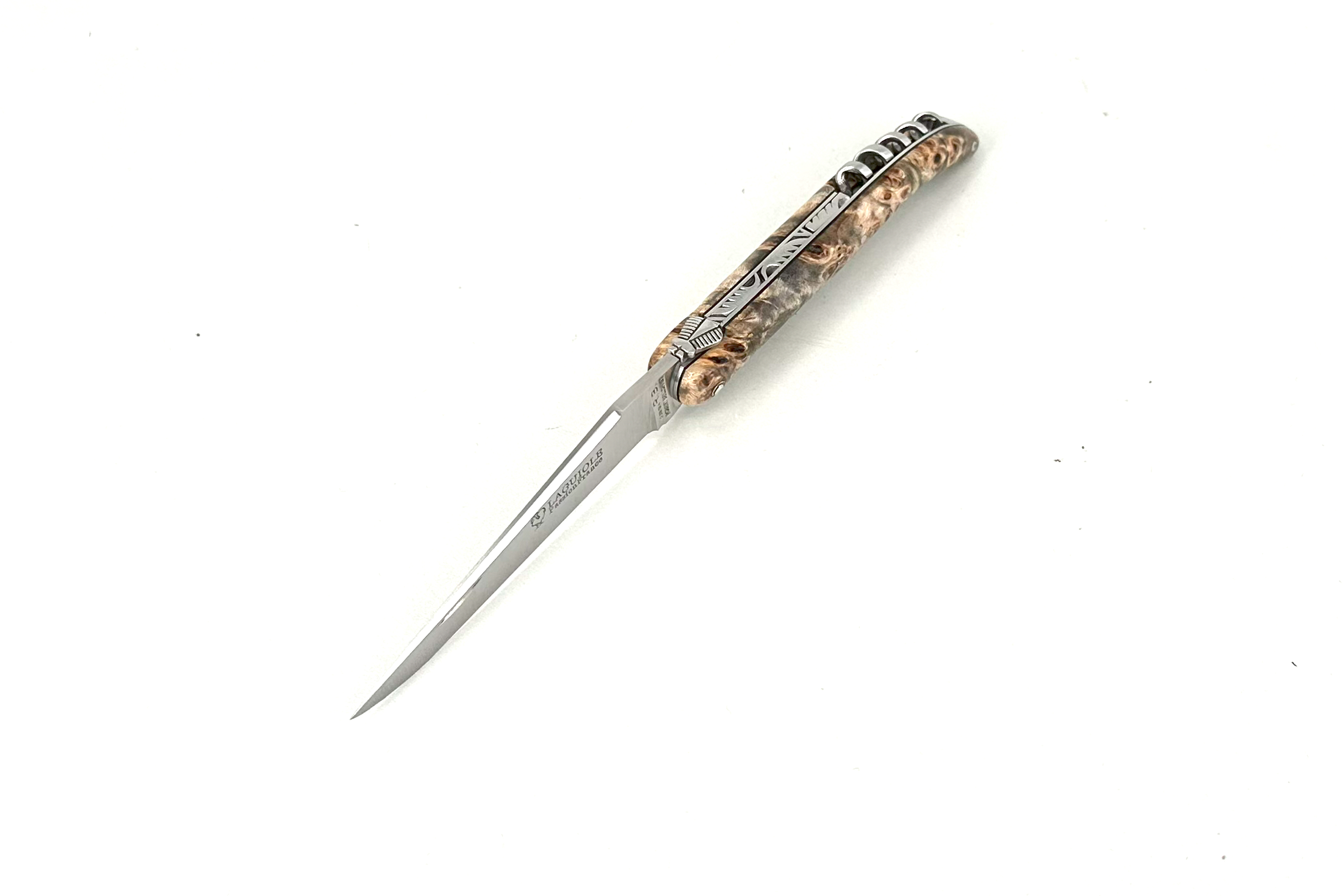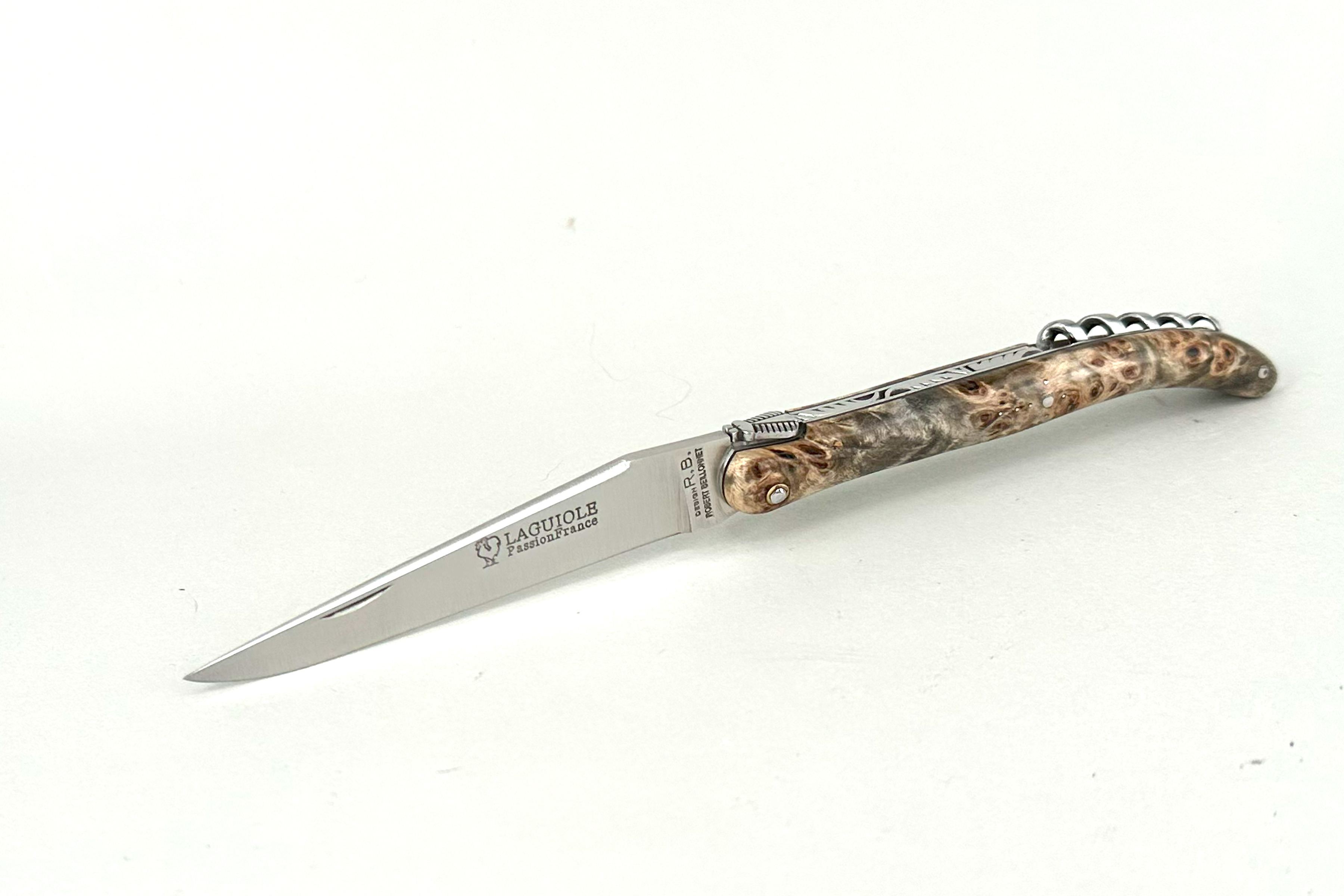 Fact Sheet LAGUIOLE PassionFrance® LUXE medium 11cm, Zweiteiler mit Klinge und Korkenzieher, stabilisierte Fliederesche Maserknolle, Ressort guillochiert, 12C27, Design Robert Beillonnet mof²
