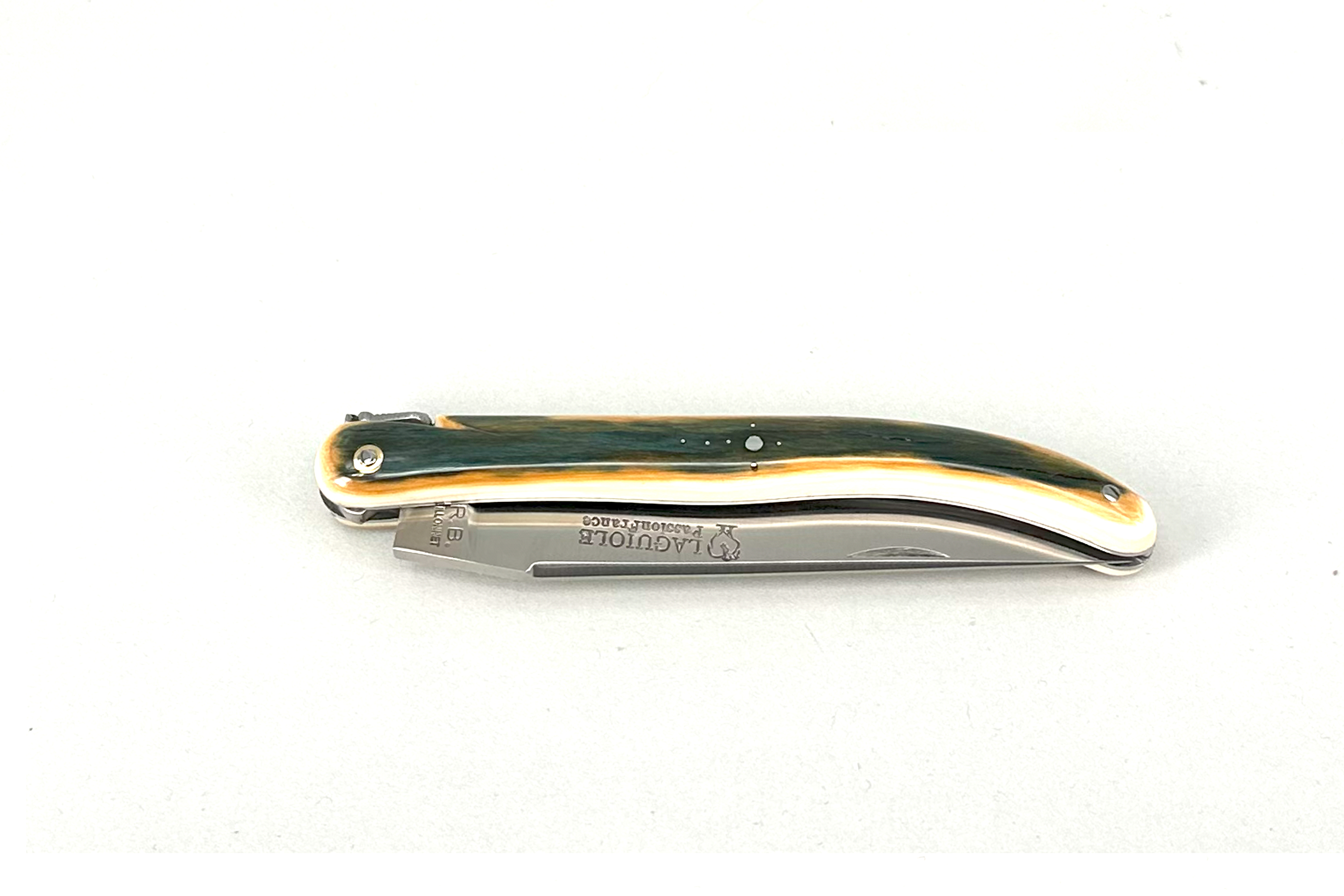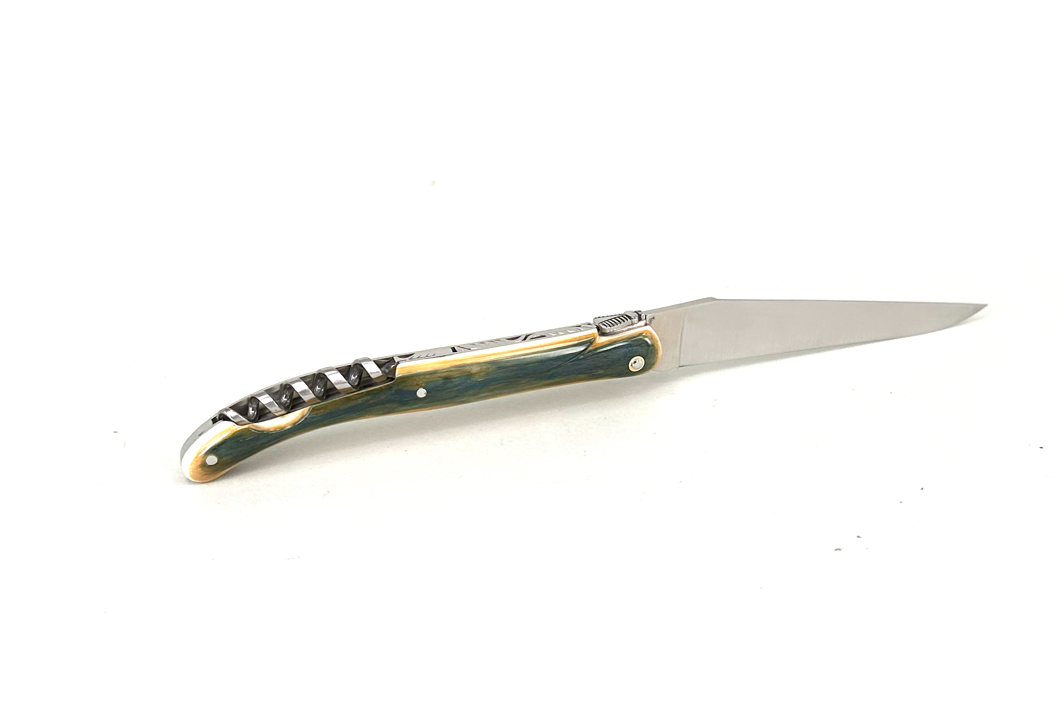 Fact Sheet LAGUIOLE 11cm PassionFrance® UNIKAT, Zweiteiler mit Klinge und langem Korkenzieher, blauer Mammut-Stoßzahn, guillochiertes Ressort, 12C27