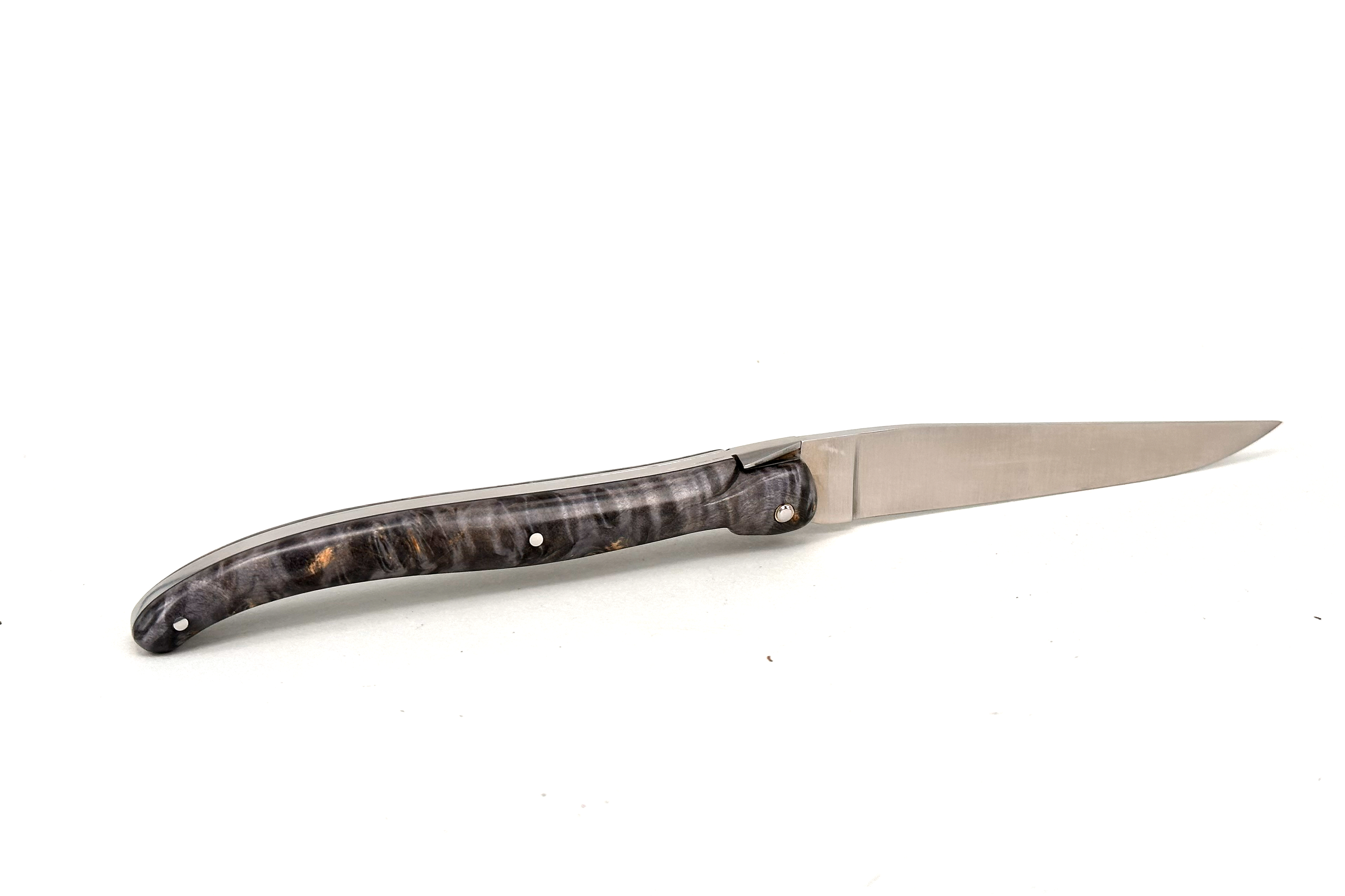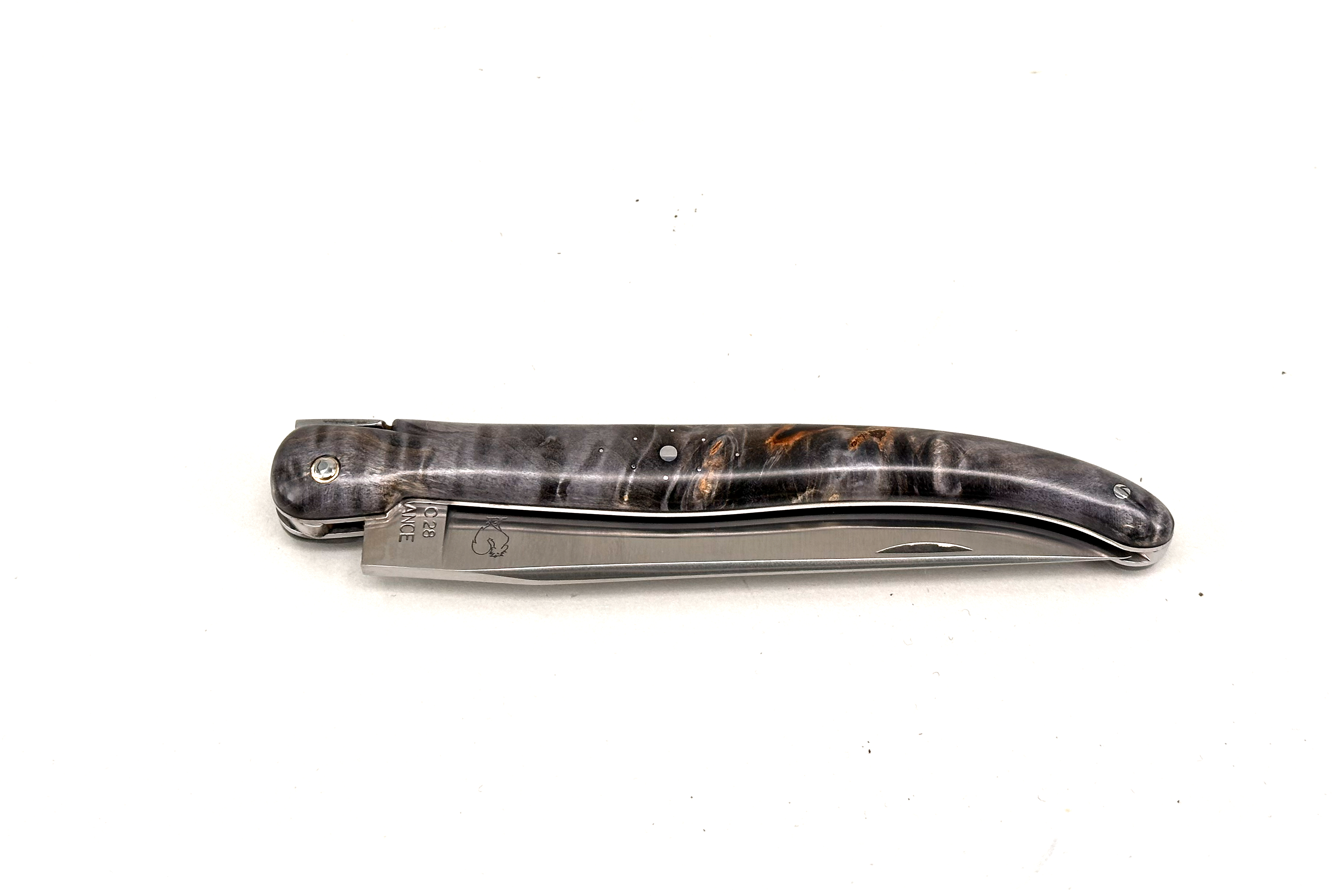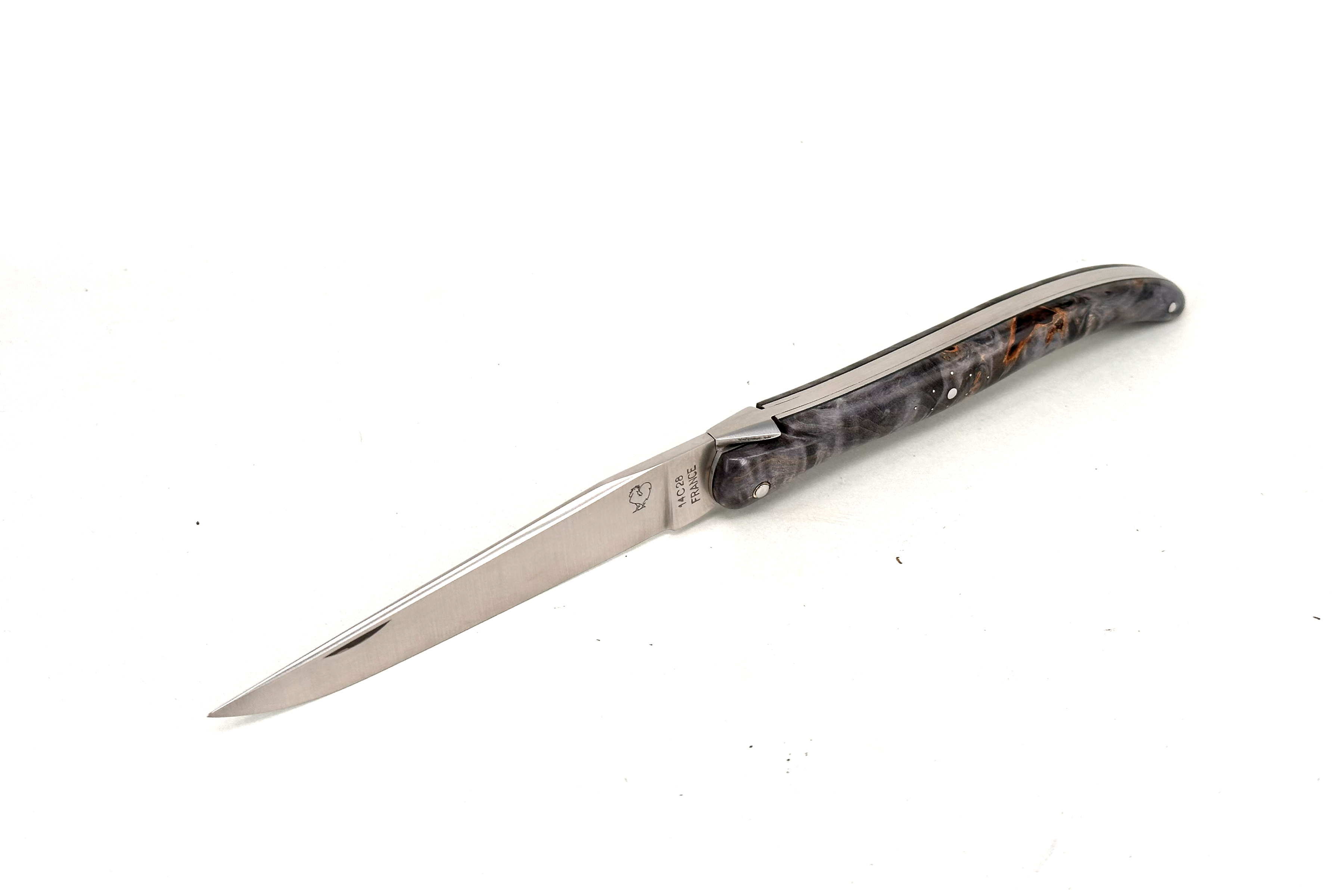 Fact Sheet: Grand-LAGUIOLE PassionFrance® CUSTOM extra large 13cm, forged spring with forged mouche, stabilized maple burl, 14C28