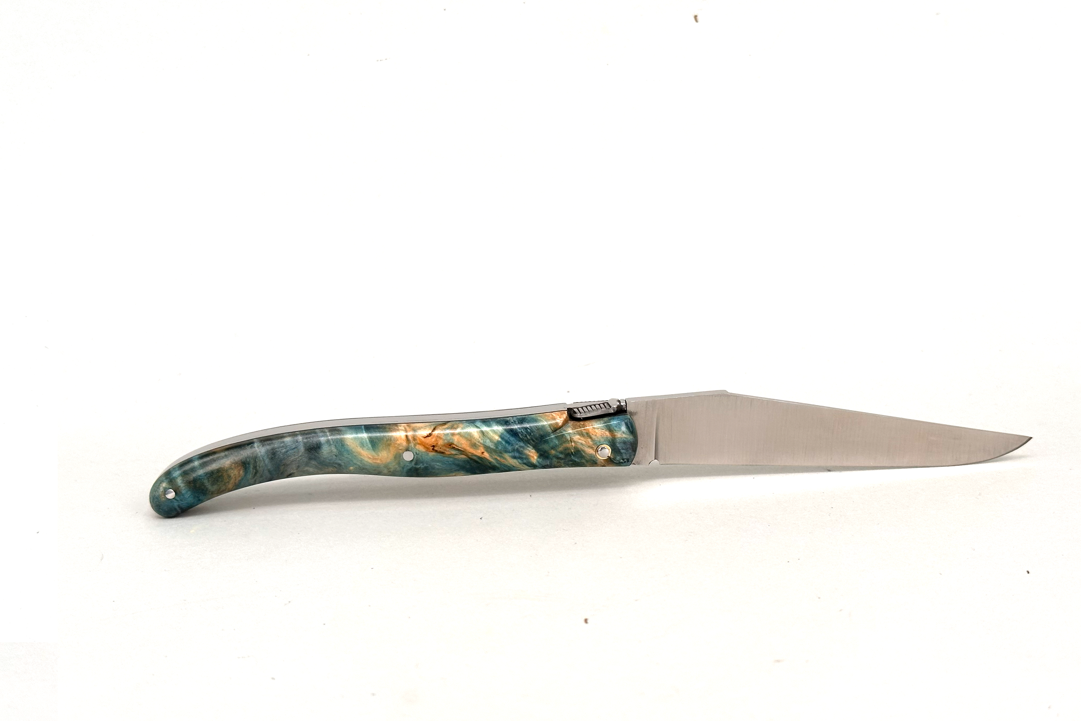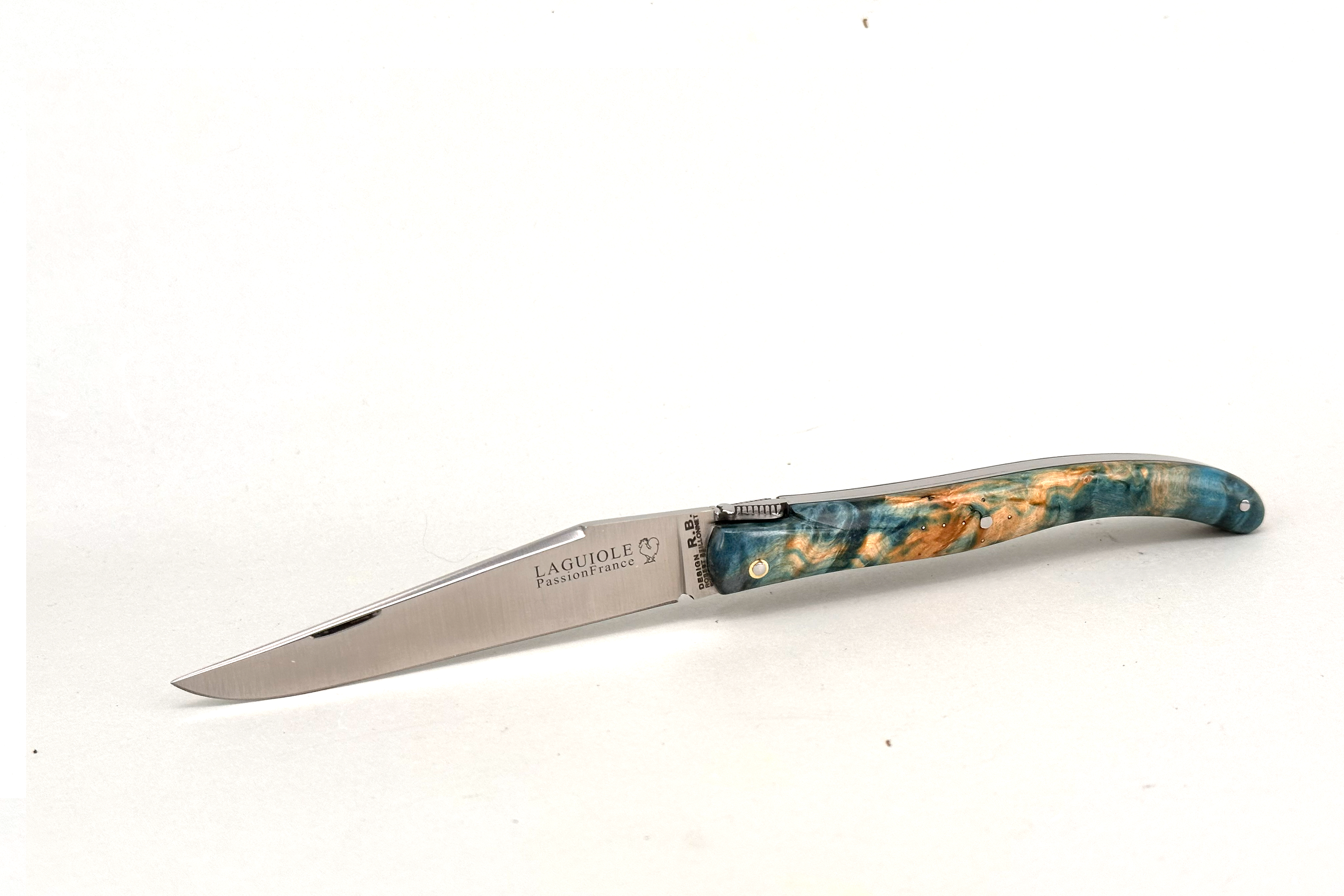 Fact Sheet: Grand-LAGUIOLE PassionFrance® CUSTOM 12cm, special edition with handle scales made from rare maple burl burl stabilised and dyed by #NOVAWOOD and RWL34 blades.  Forged mouches. Design Robert Beillonnet mof².