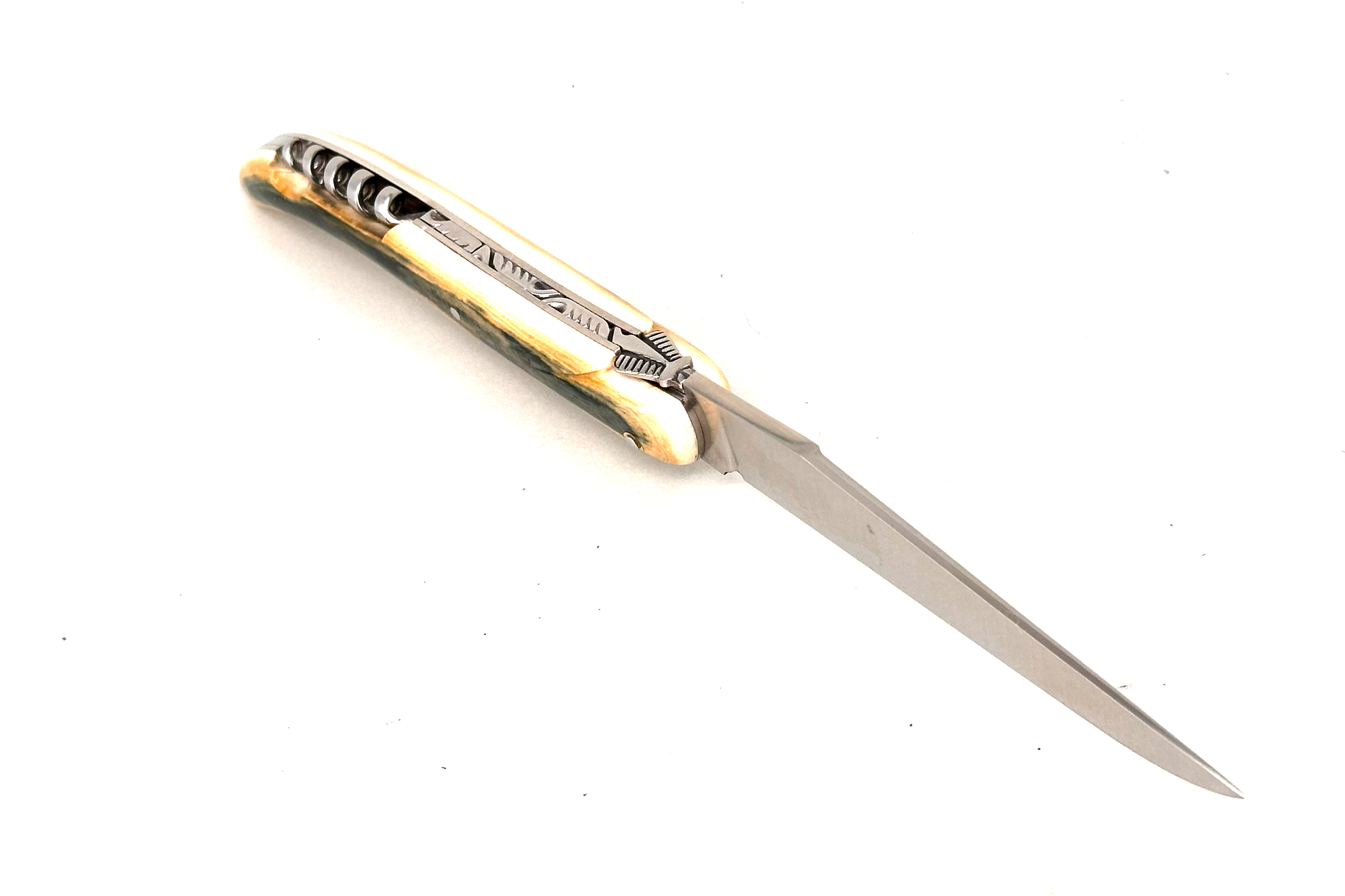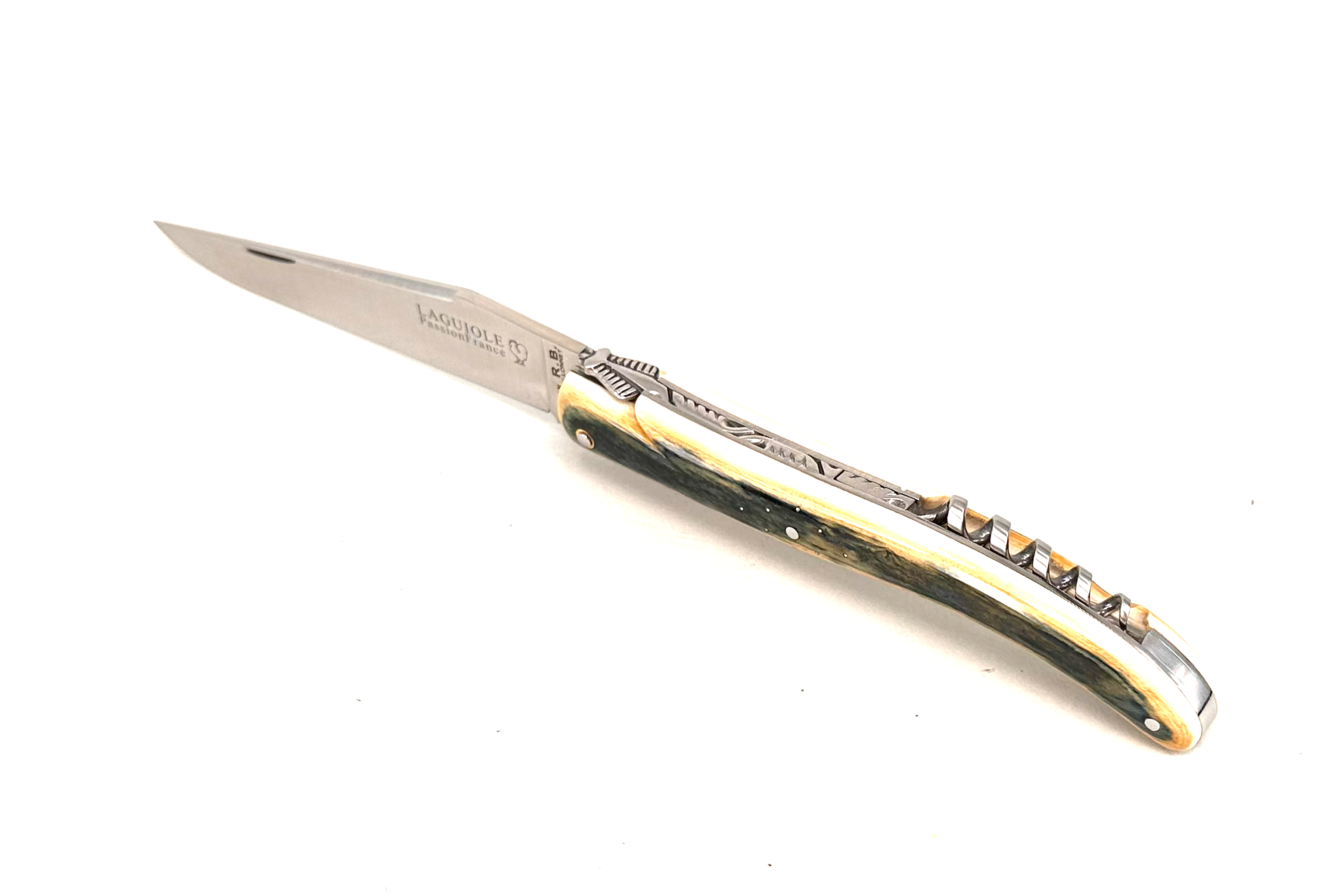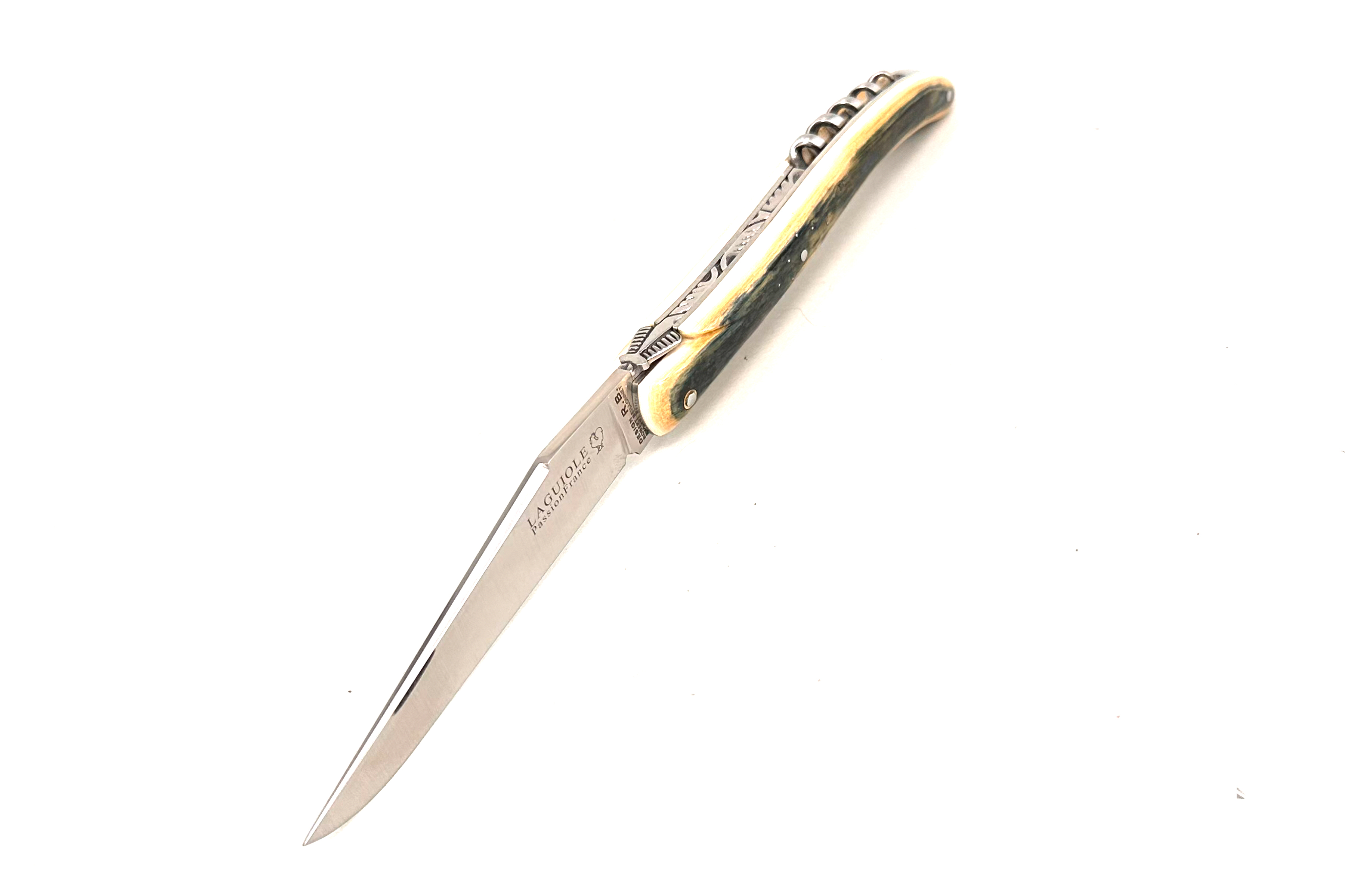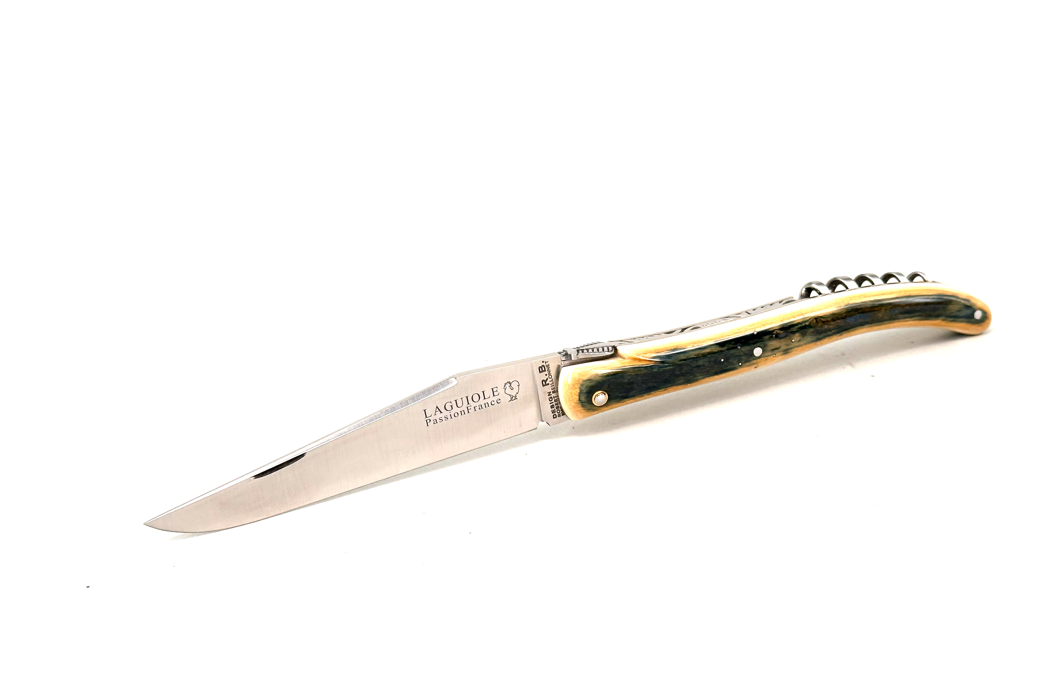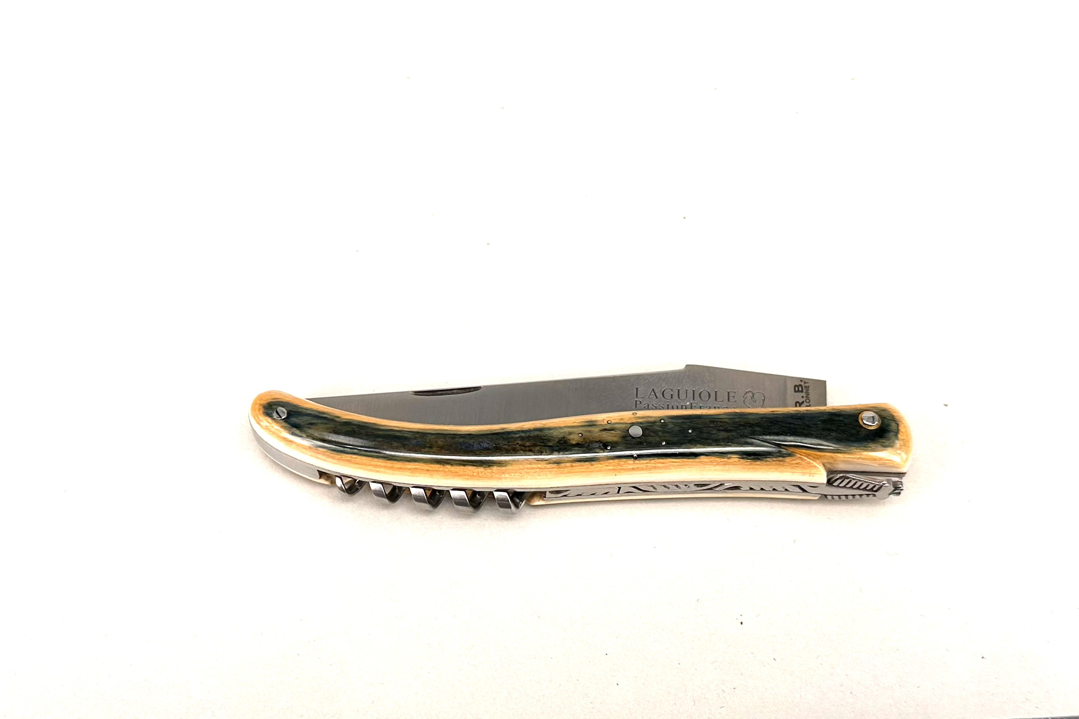 Grand-LAGUIOLE PassionFrance® CUSTOM avec tire-bouchon. Manche de défense de mammouth bleu. Création du deux fois Meilleur Ouvrier de France Robert Beillonnet. Lame en RWL34 avec biseau et casse-goutte dont le contact de la lame avec le ressort est supprimé par rivet avec biseau et casse goutte. Tire-bouchon conique longue et décalé latéralement. Mouche forgée. Signe d'authenticité, il porte sur la lame le blason de PassionFrance®, le Coq ... en savoir plus sur LAGUIOLE