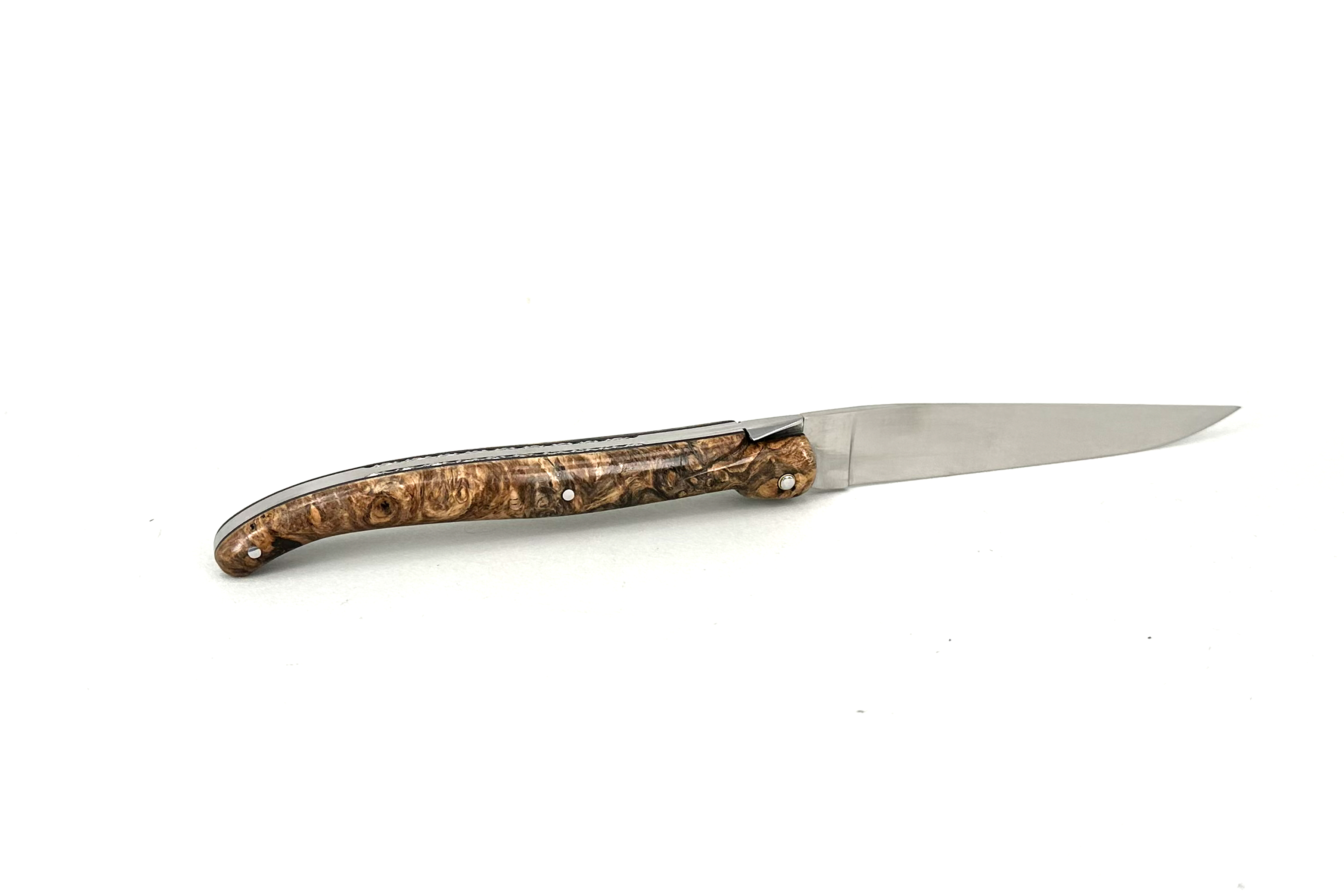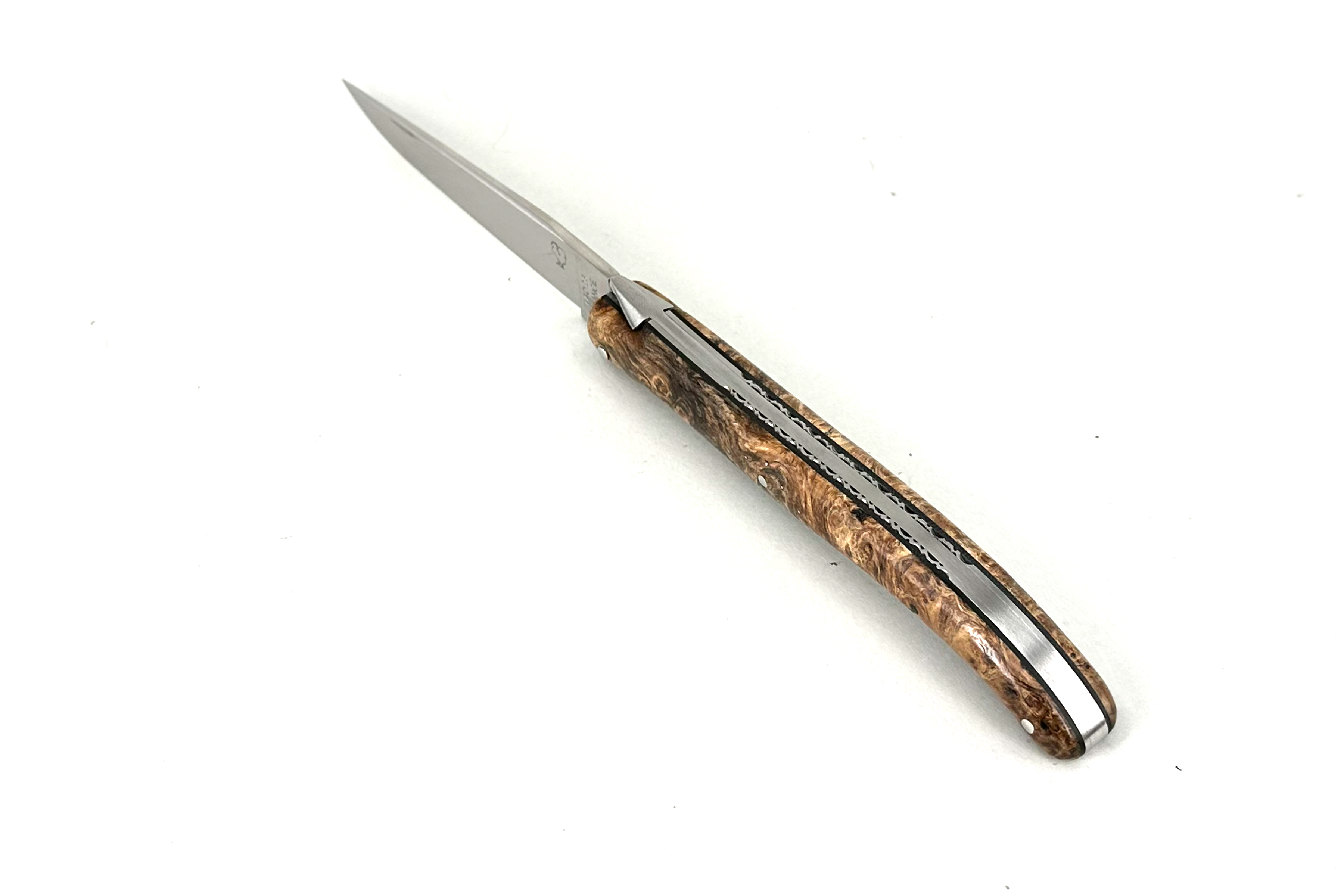 Fact sheet : Grand-LAGUIOLE PassionFrance® CUSTOM extra large 13cm, ressort et mouche forgés, platines décorées, loup de châtaignier stabilisé, 14C28