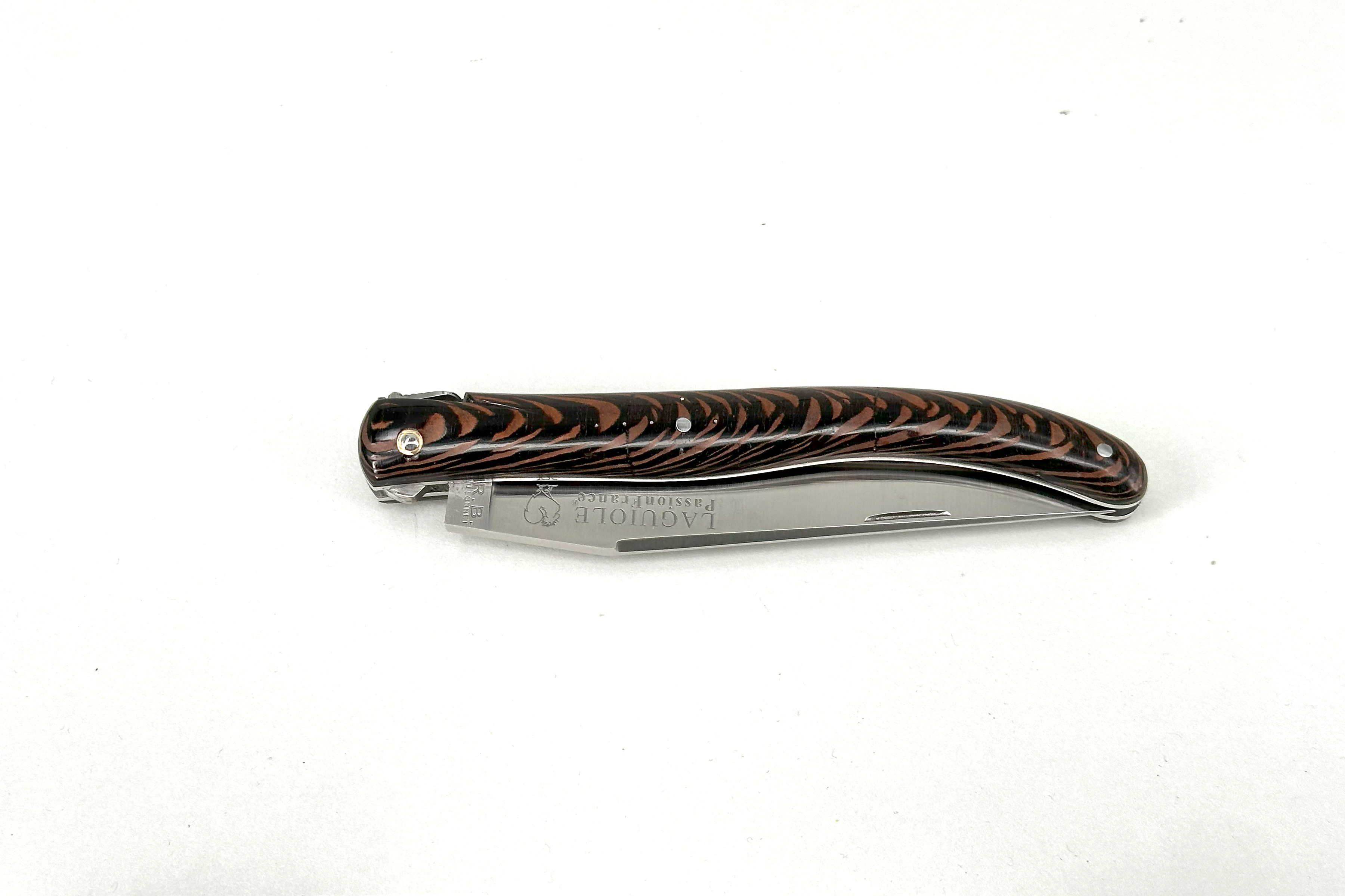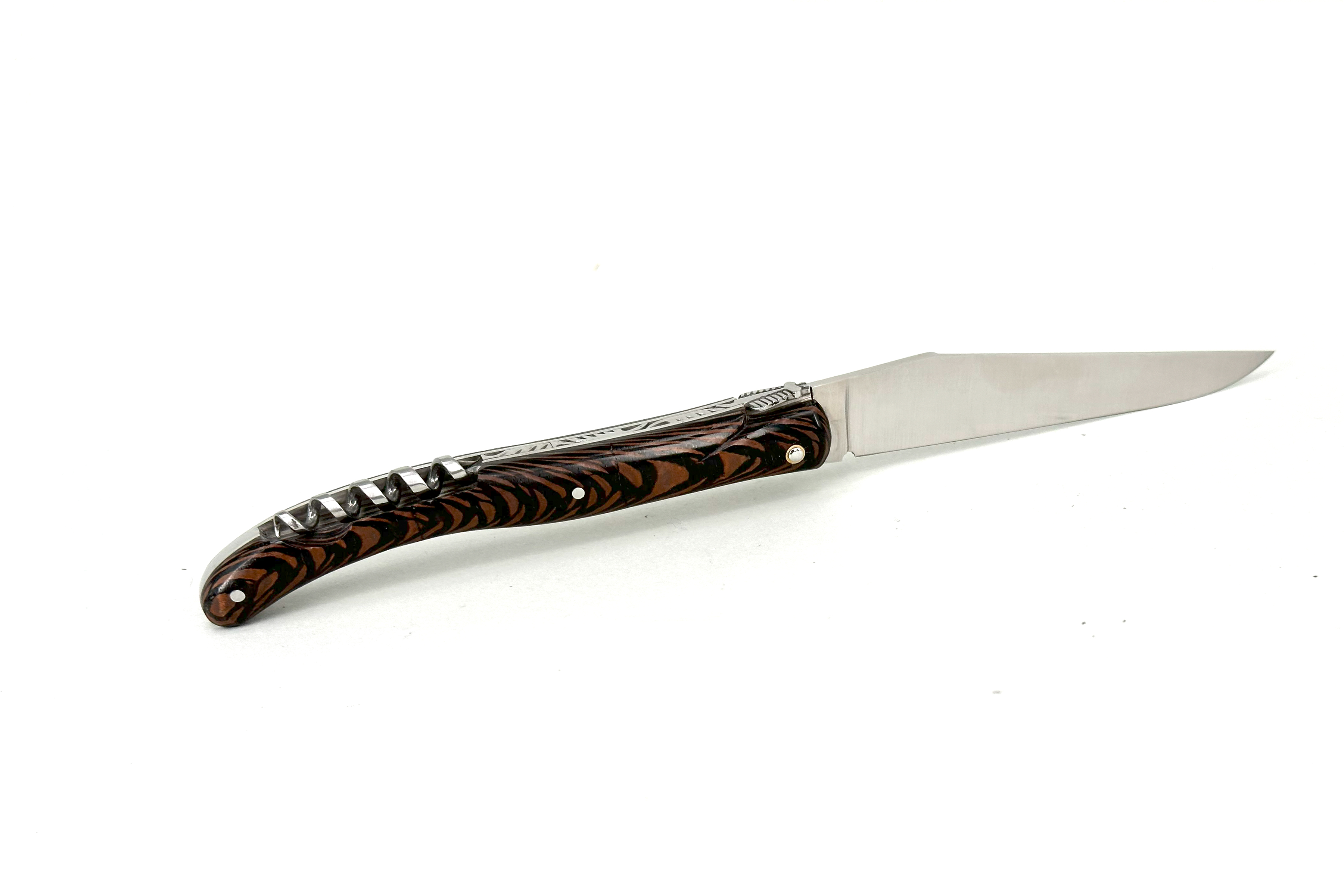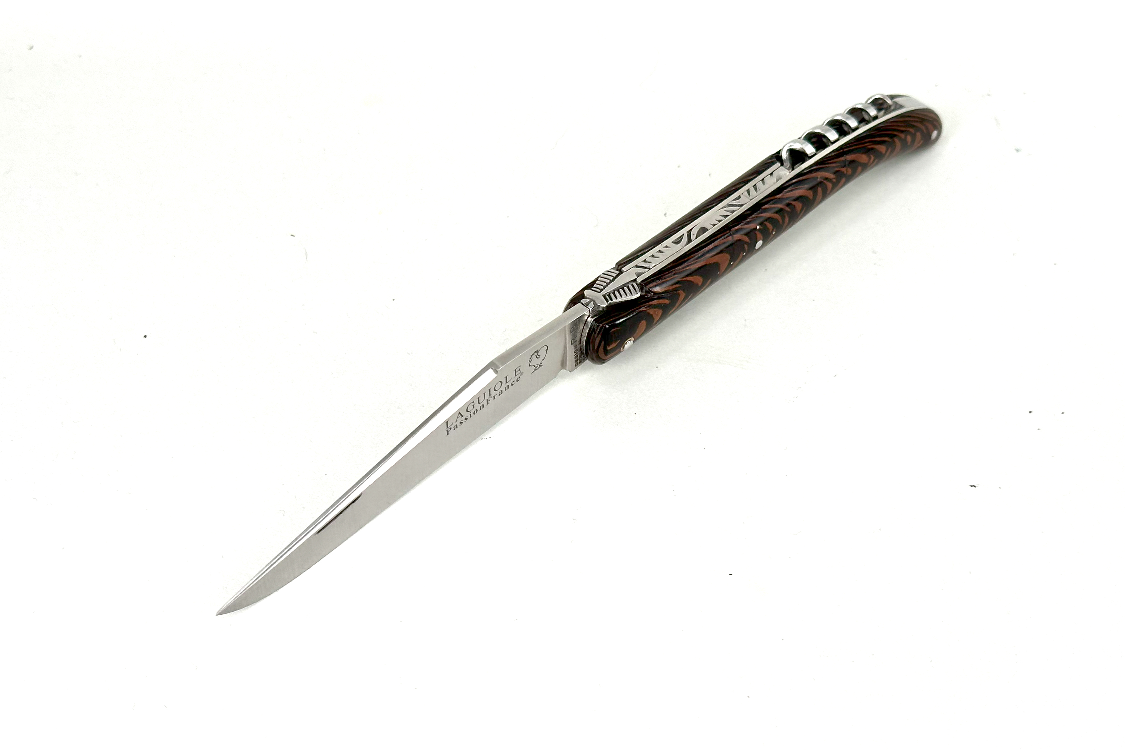 Grand-LAGUIOLE PassionFrance CUSTOM avec tire-bouchon, manche de bois de perle stabilisé. Nos Laguioles ont été créés par le deux fois Meilleur Ouvrier de France Robert Beillonnet. Ils ont gagné l'INTERNATIONAL KNIVE AWARD de l'IWA à Nuremberg et ont été couronnées par l'award spécial « KNIFE OF THE YEAR 2010 ». En signe d'authenticité, ils portent sur la lame le blason de PassionFrance®, le coq ... en savoir plus sur LAGUIOLE