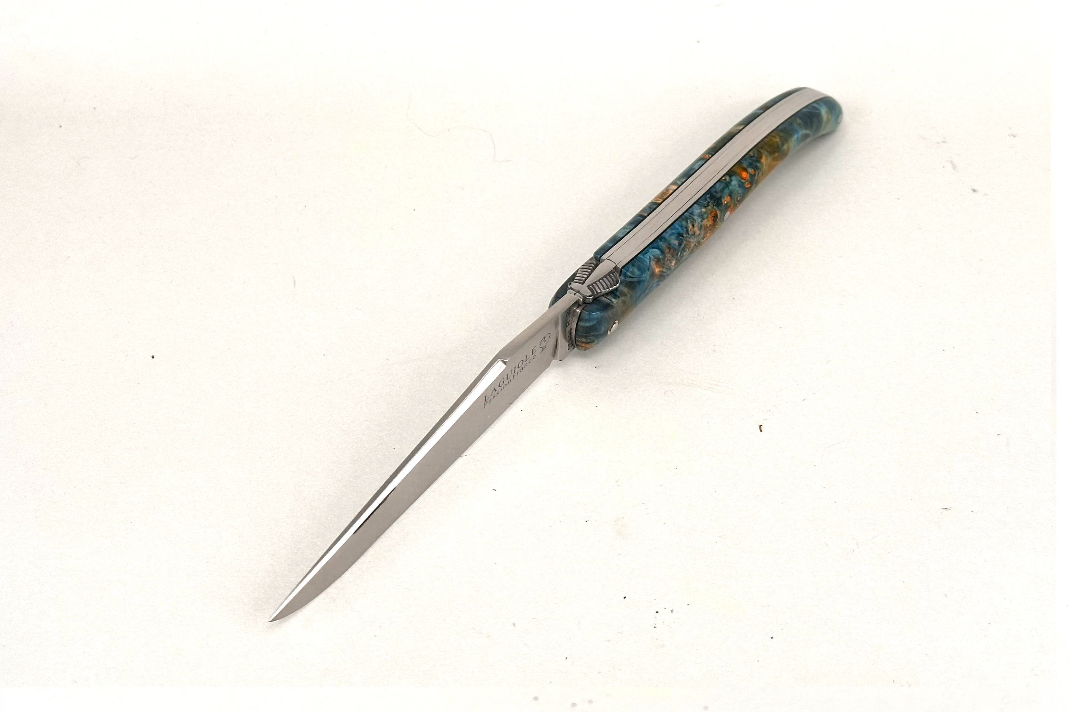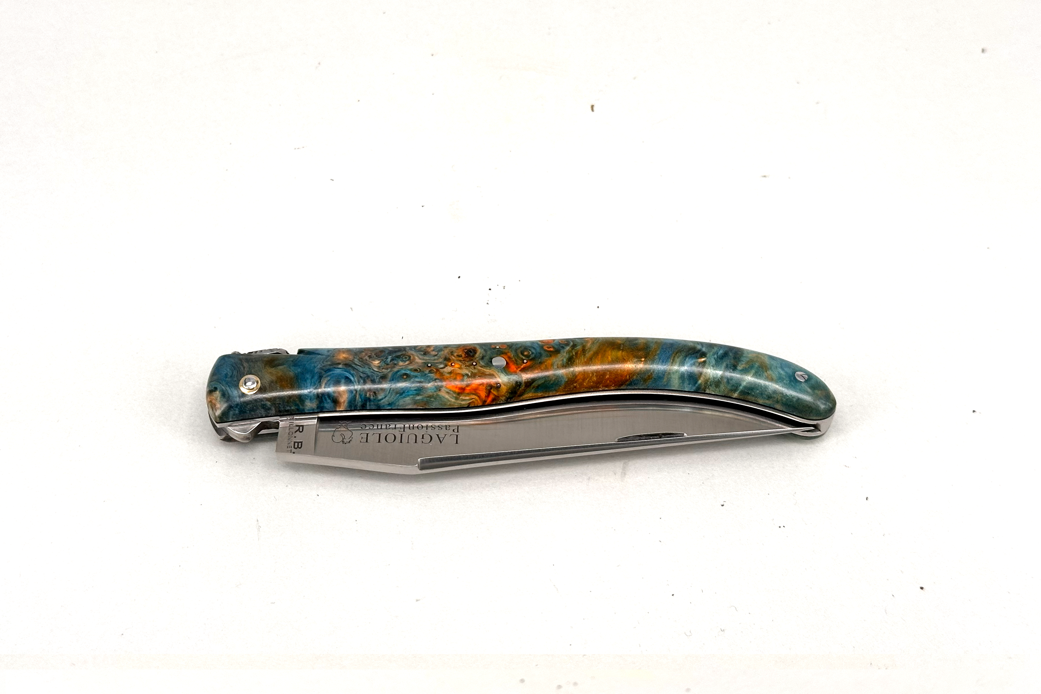 Fact Sheet : Grand-LAGUIOLE PassionFrance® CUSTOM 12cm, Design Robert Beillonnet mof², mouche forgée, manche loup d'érable stabilisé et teinte, lame RWL34.