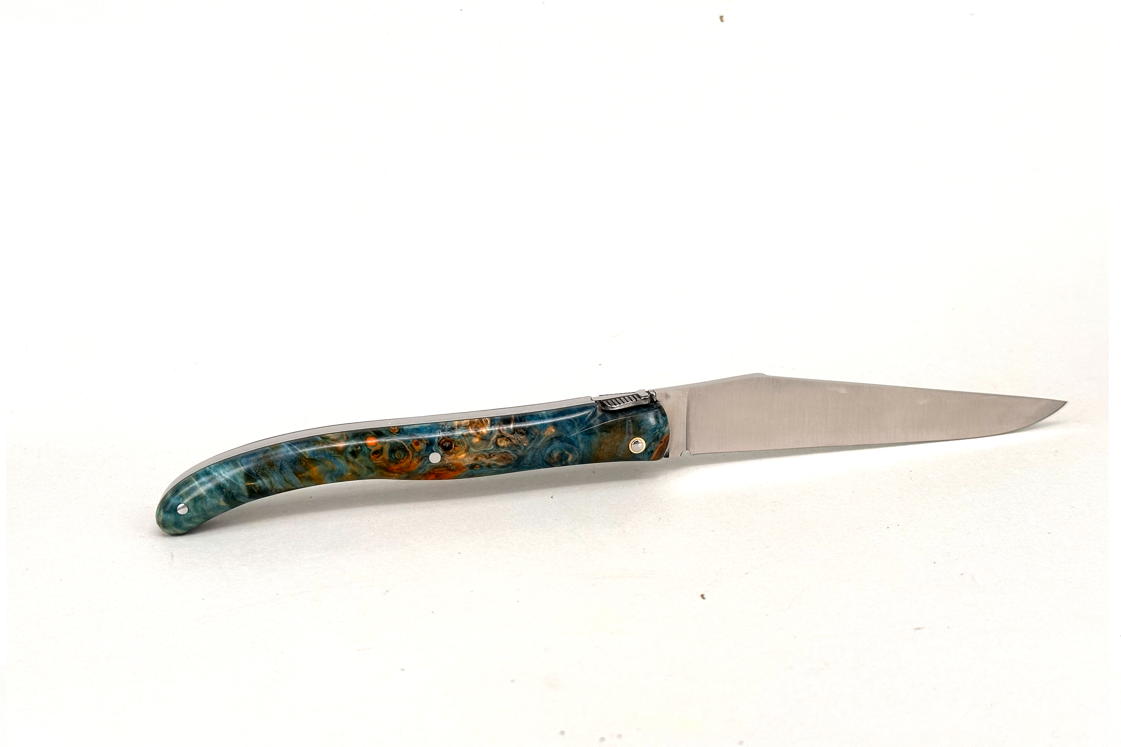 Grand-LAGUIOLE PassionFrance® CUSTOM 12cm, édition spéciale avec manches en rare loup d'érable expressif stabilisé et teinté par #NOVAWOOD et avec lames de RWL34. Nos Laguioles ont été créés par le deux fois Meilleur Ouvrier de France Robert Beillonnet. Ils ont gagné l'INTERNATIONAL KNIVE AWARD de l'IWA à Nuremberg et ont été couronnées par la distinction « KNIFE OF THE YEAR 2010 ». En signe d'authenticité, ils portent sur la lame le blason de PassionFrance®, le Coq … savoir plus sur LAGUIOLE