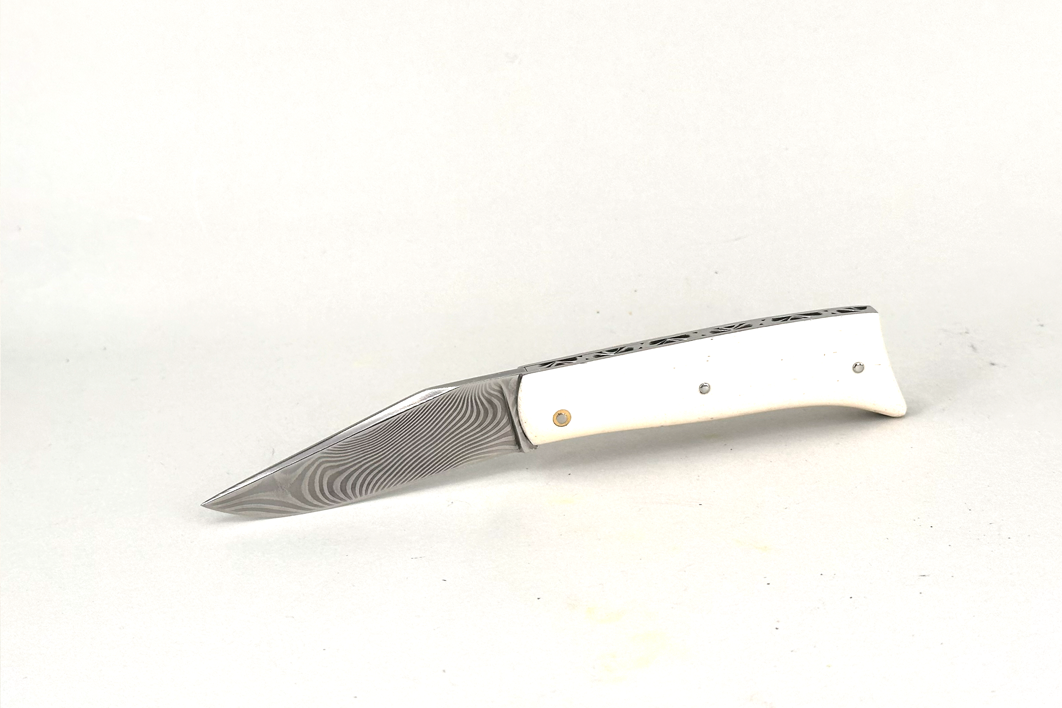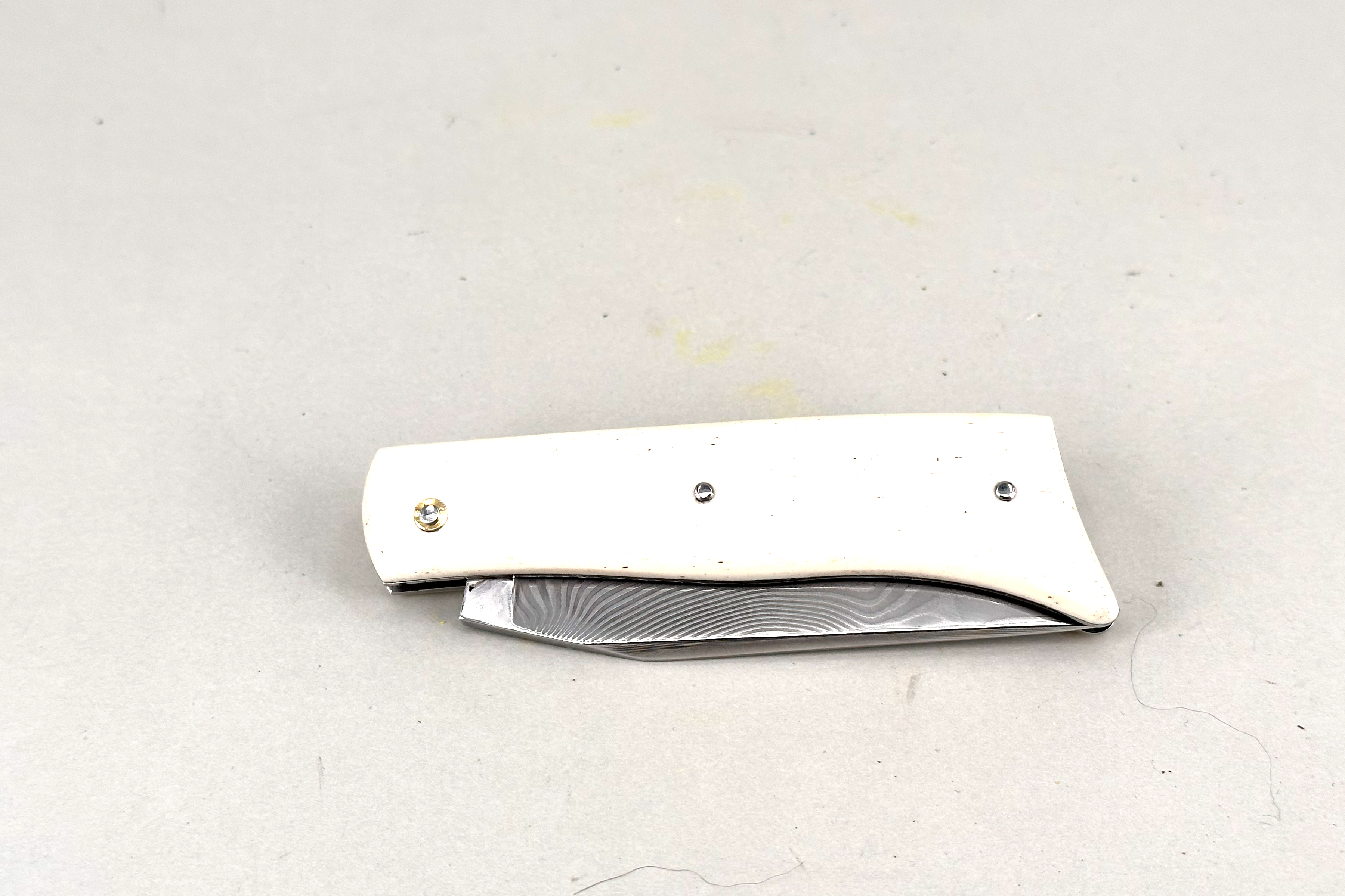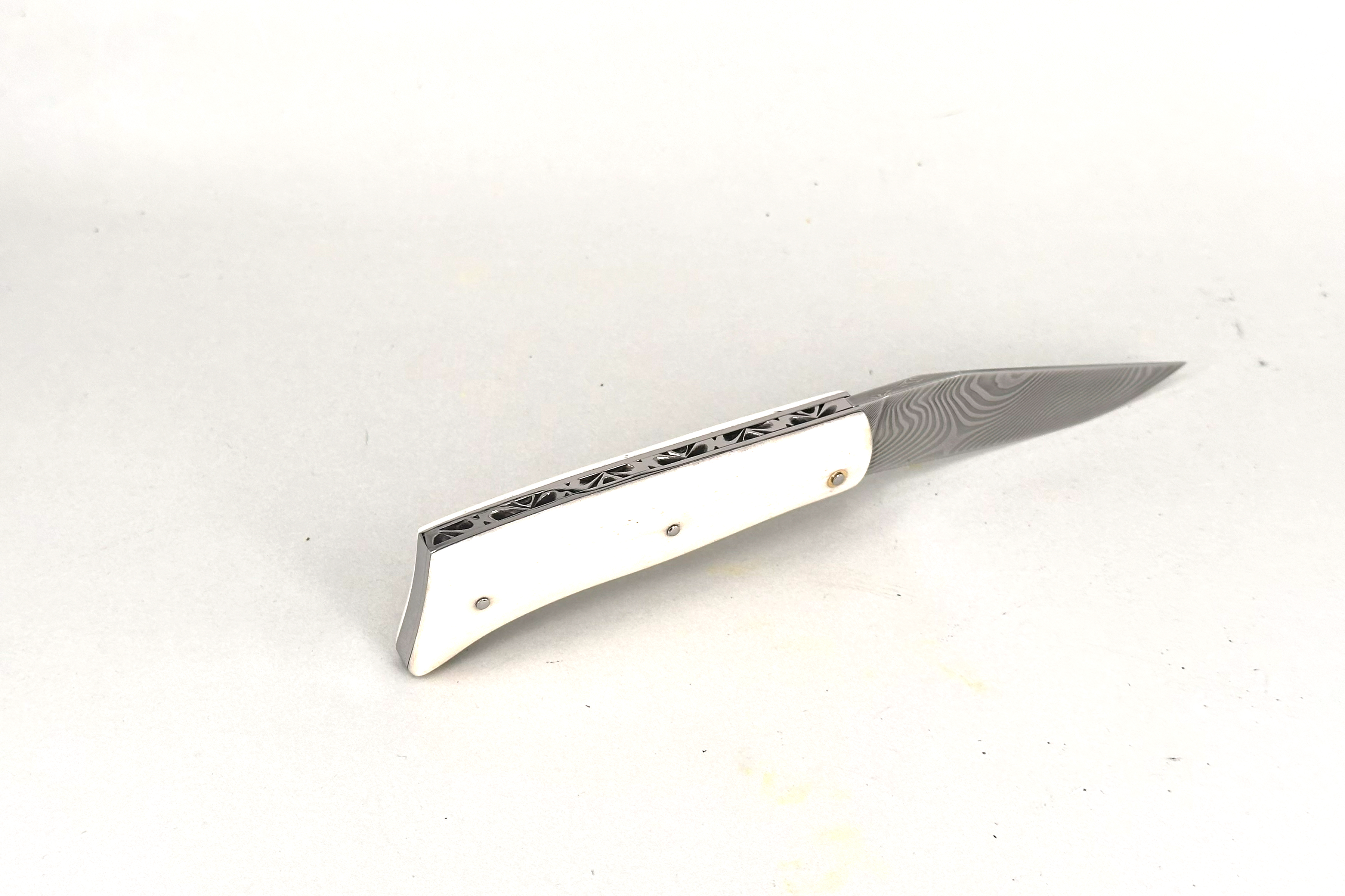 Customized Petit-ALPIN Griff Rinderknochen mit gewölbten Niete. Ressort guillochiert. Klinge handgeschmiedeter Inox-Damast von Balbach