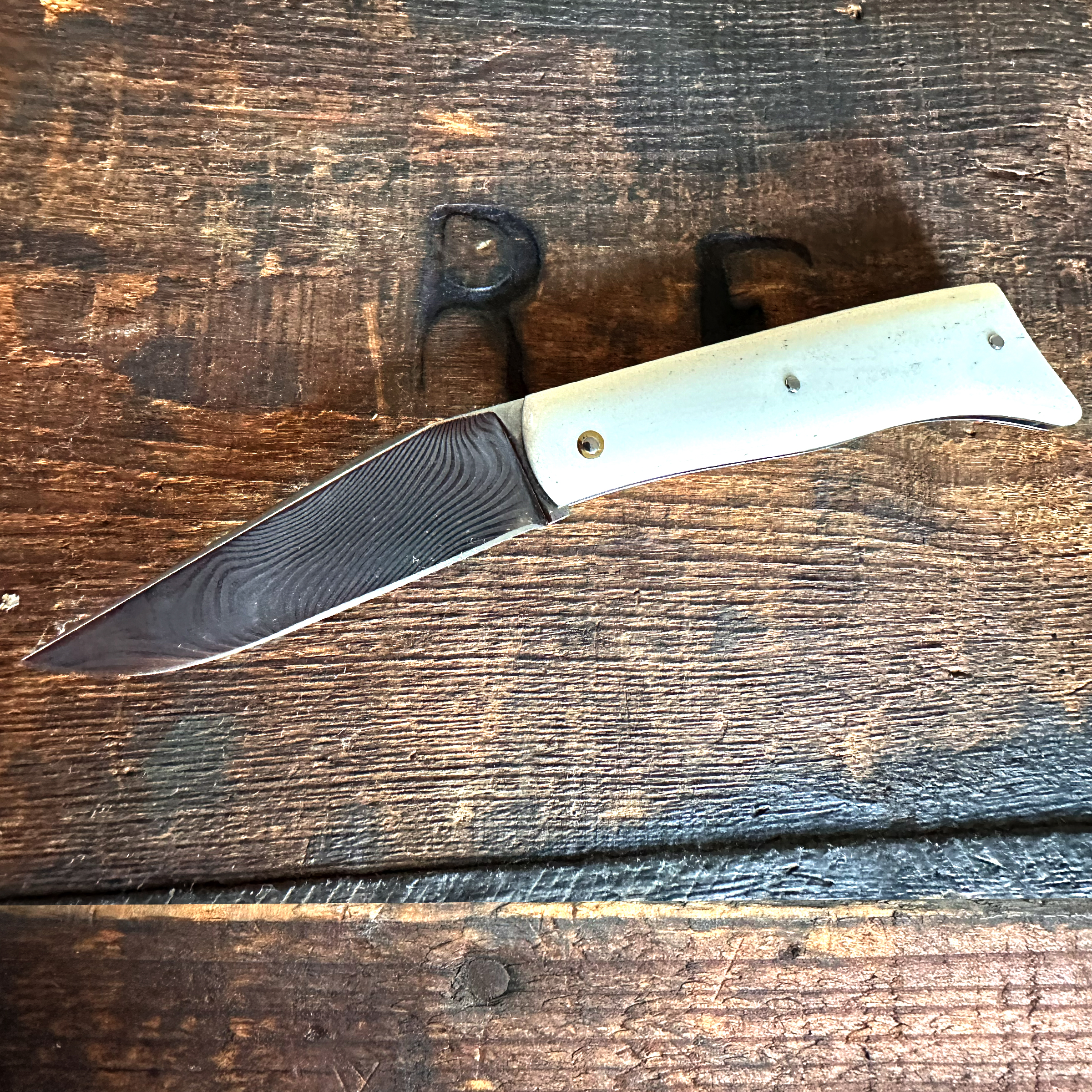Customized Petit-ALPIN Griff Rinderknochen mit gewölbten Niete. Ressort guillochiert. Klinge handgeschmiedeter Inox-Damast von Balbach