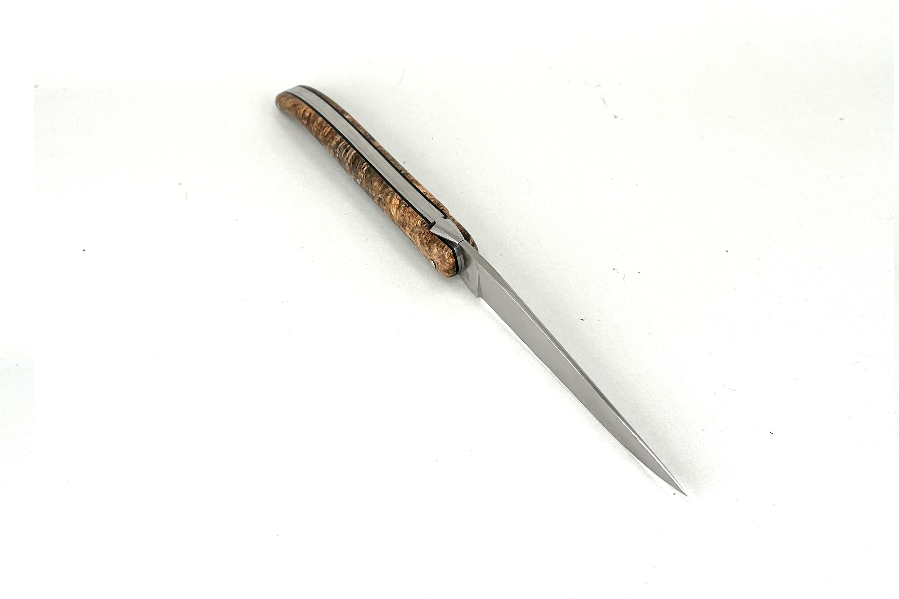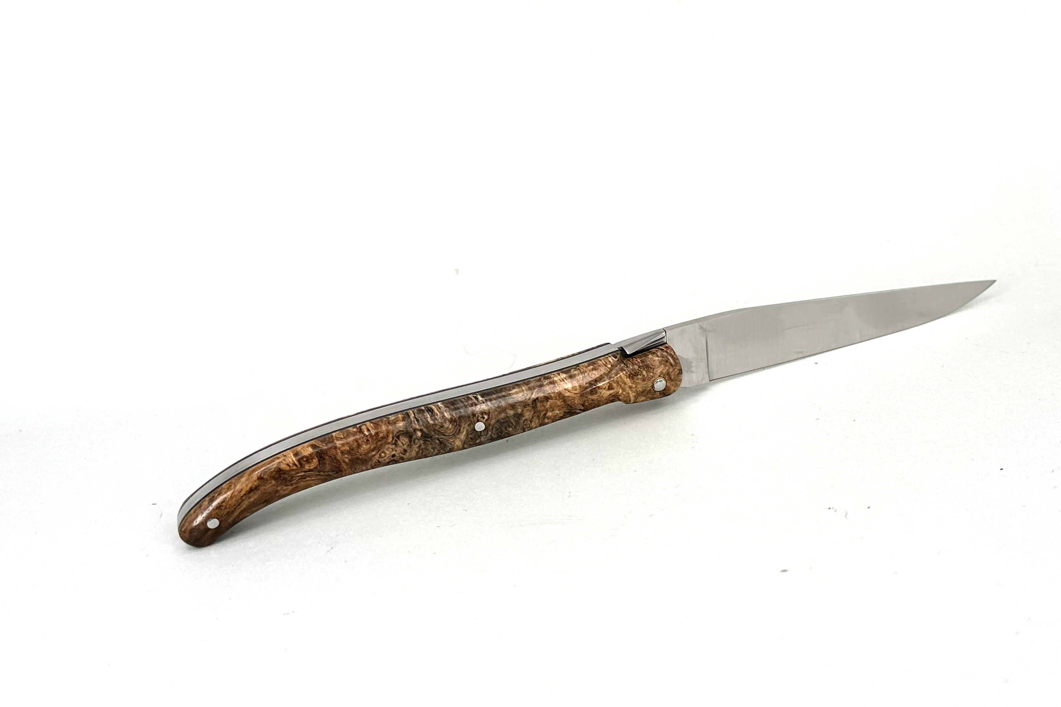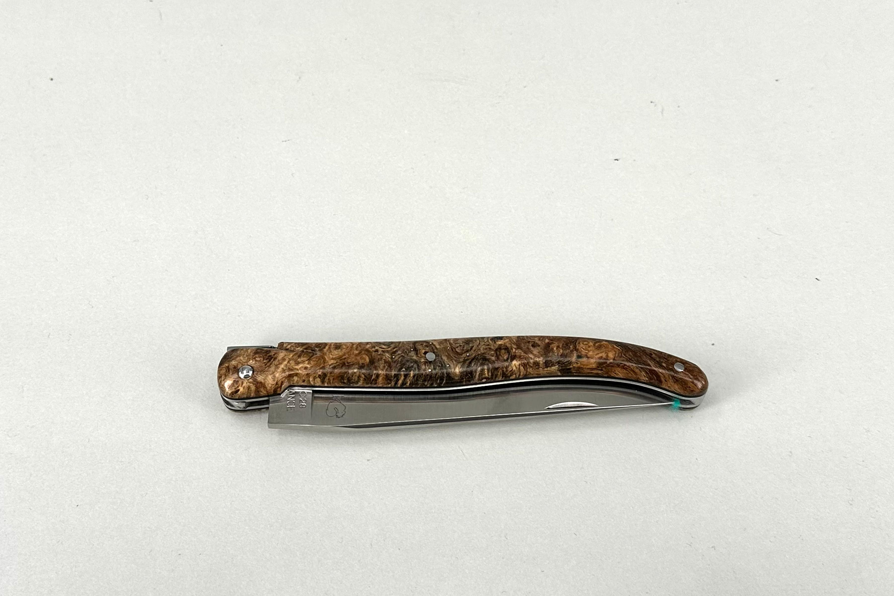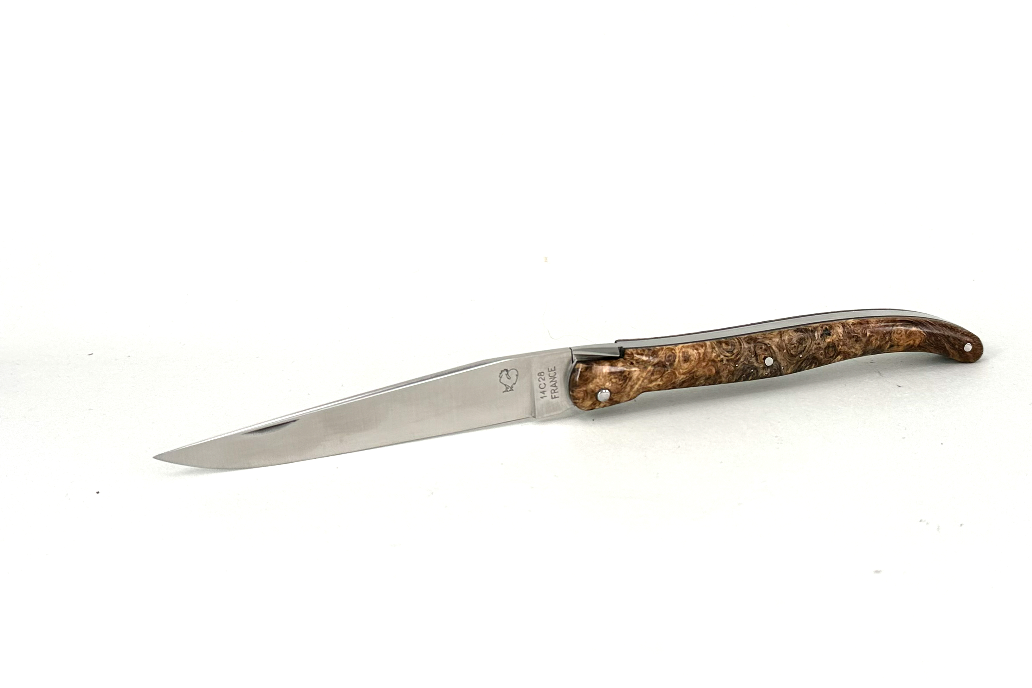 Fact Sheet: LAGUIOLE PassionFrance® CUSTOM extra large13cm, Einteiler mit Klinge, glattes, geschmiederes Ressort mit geschmiedeter Mouche, stabilisierte Amboina Maserknolle, 14C28