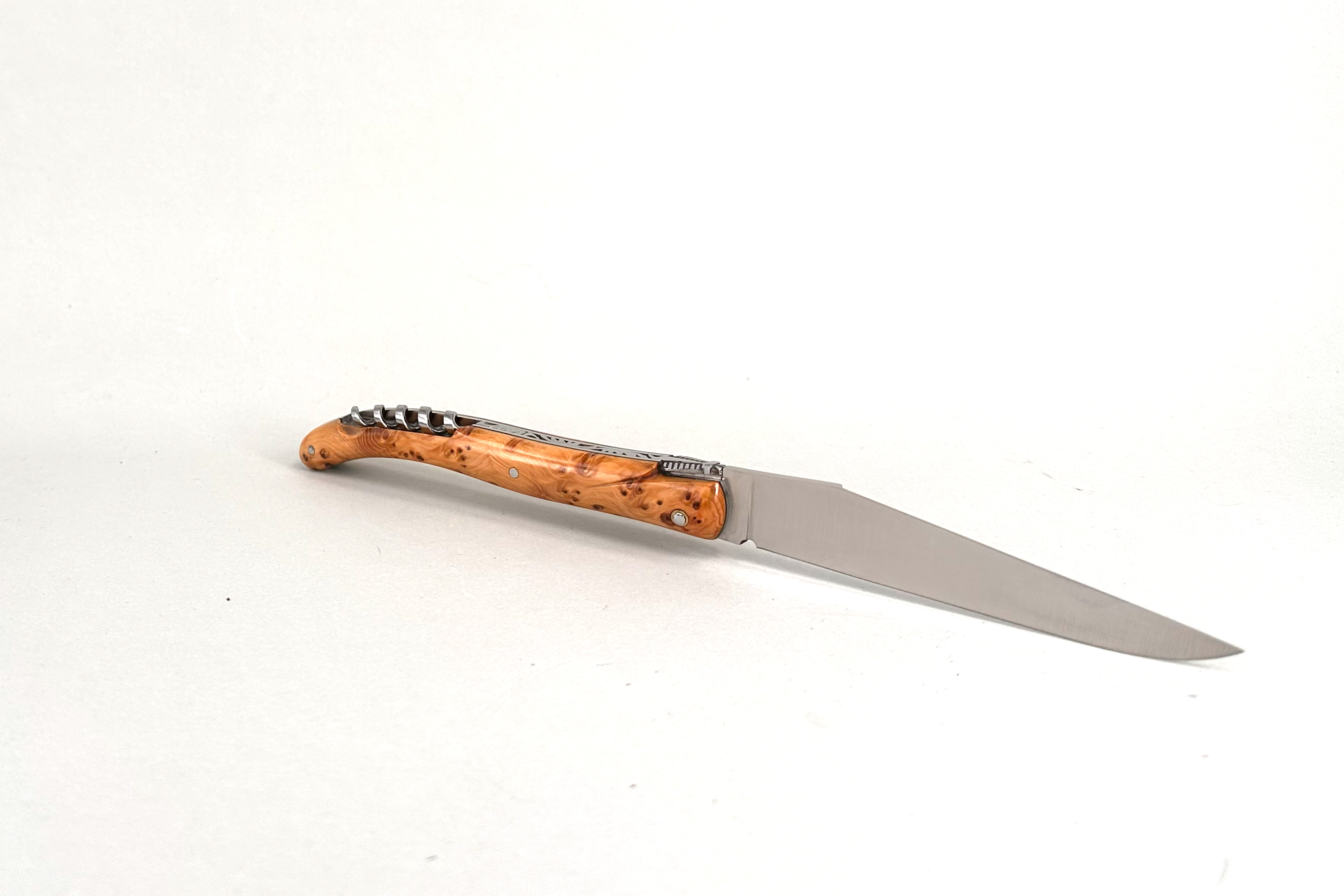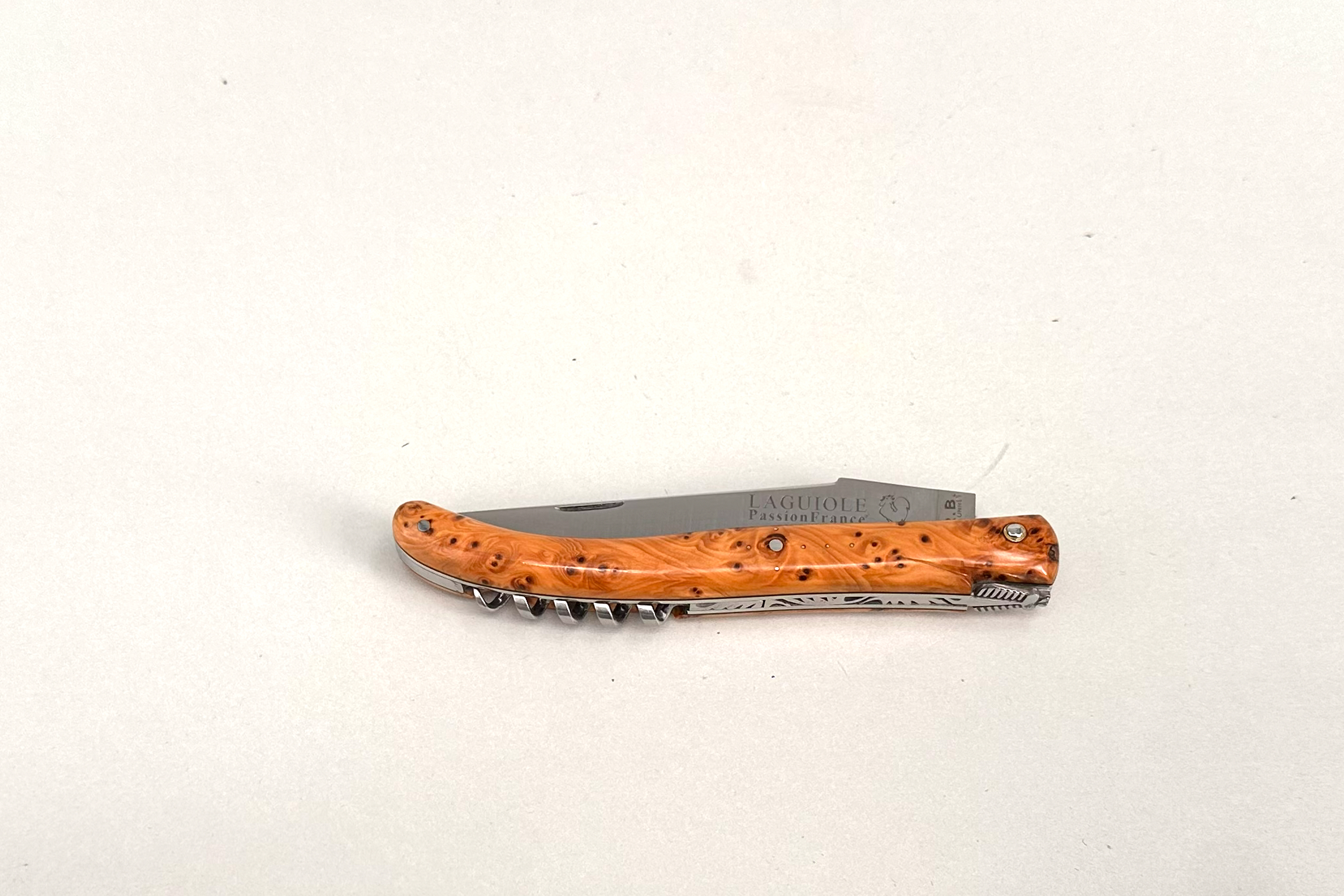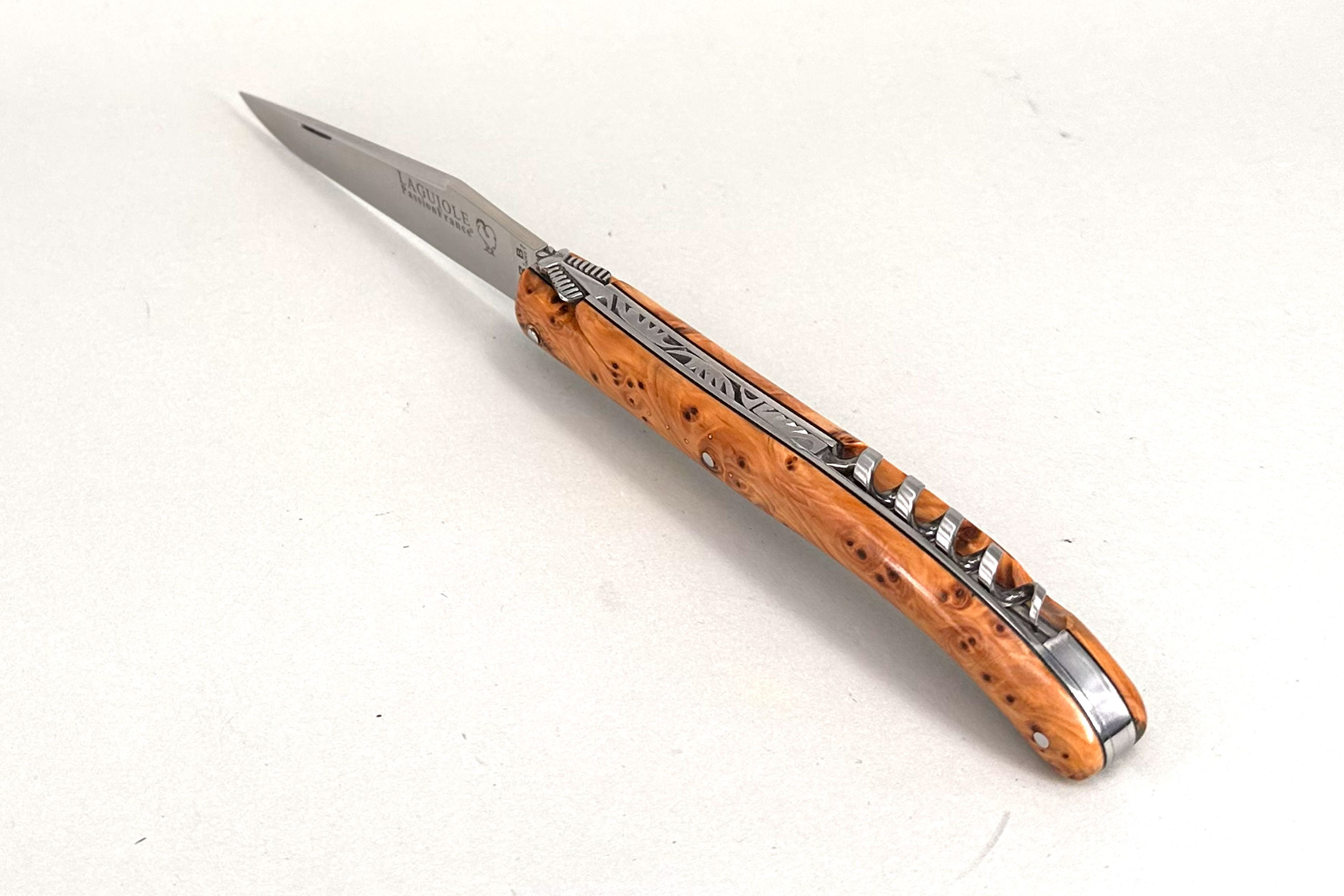 Fact Sheet Grand-LAGUIOLE PassionFrance® CUSTOM mit Korkenzieher, stabilisierte Pfeffereibe Maserknolle, guillochiertes Ressort, Design Robert Beillonnet mof², Klinge 14C28