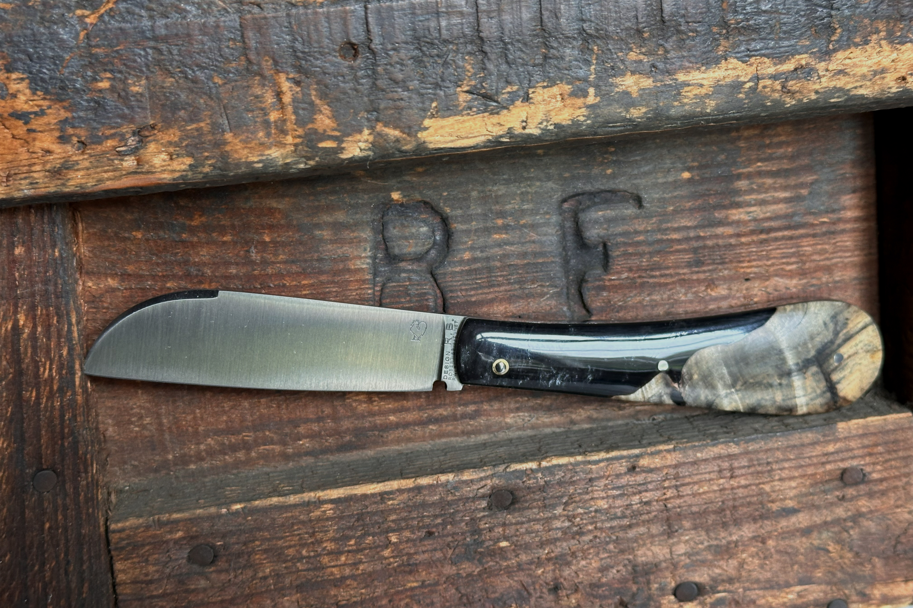 LONDON CUSTOM, Entwurf des zweifachen Meilleur Ouvrier de France Robert Beillonnet (bester Handwerker Frankreichs) für PassionFrance®. Aufschlagfreie Klinge mit Stop-Pin, Fehlschärfe und markanter, frontaler Rückenfase. Klingenstahl  RWL34. Unser LONDON ist geschützt. Wir fertigen es zu 100% in Handarbeit in unserem Atelier in Frankreich. Als Zeichen seiner Echtheit trägt es auf der Klinge das Wappen von PassionFrance®, den Coq ... mehr über das LONDON